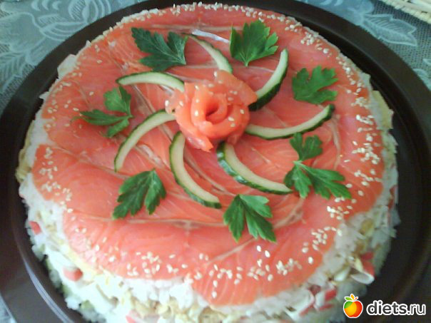 5. Через 1 час снять груз, вытащить тортик из формы. Перевернуть на тарелку рыбным слоем вверх.