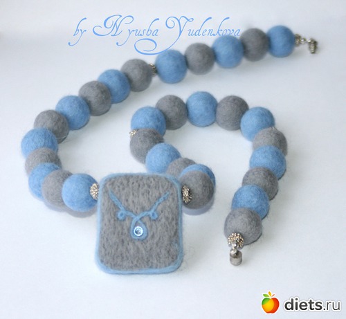 Серо-голубое сочетание цветов. Кулон сделан так же из шерсти, выполнен в форме прямоугольной рамки, в центре рисунок и голубая страза. В изделии присутствует металлическая фурнитура.