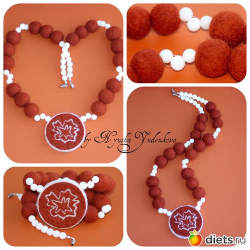 Ассоль. Промежуточные бусины сделаны из перламутра. Войлочные бусы кирпичного цвета с добавлением белого, кулон так же сделан из войлока.