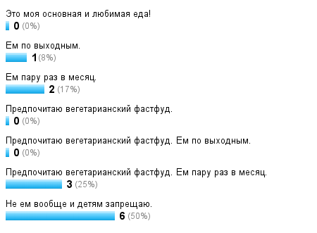 Я сначала ответила на опрос, а потом мне стало интересно - а что вы подразумевали по "вегетарианским фастфудом"? Картошку фри в Макдональдсе и пиццу "Моцарелла" в любой пиццерии или вегетарианские сэндвичи и прочую "быструю еду", которую можно купить в вегетарианских магазинах, кафе и ресторанах?