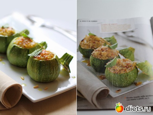 На сковороде пассеровать лук в сливочном масле, добавить мякоть цукини и тушить всё минут 10. Добавить рис. Готовить ризотто, постепенно вливая горячий овощной бульон. В середине приготовления добавить небольшой пучок мяты и орешков пинии (последние надо предварительно подрумянить на сковороде). В конце добавить пармезан. Консистенция должна получится довольно жидкая.