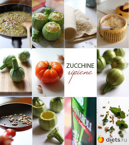 На сковороде пассеровать лук в сливочном масле, добавить мякоть цукини и тушить всё минут 10. Добавить рис. Готовить ризотто, постепенно вливая горячий овощной бульон. В середине приготовления добавить небольшой пучок мяты и орешков пинии (последние надо предварительно подрумянить на сковороде). В конце добавить пармезан. Консистенция должна получится довольно жидкая.