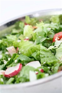 В салатницу порвите зеленый салат и добавьте редис. Перемешайте.