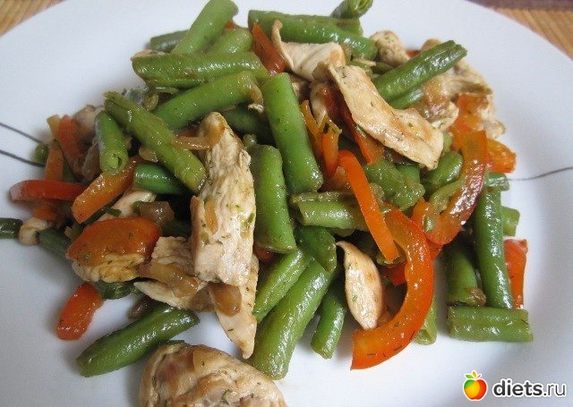 Лук и перец почистить и порезать тоже полосками. В сковороду от мяса добавить ещё масла и обжарить лук и перец, добавить фасоль и жарить минут 5 на небольшом огне до готовности овощей. Добавить курицу к овощам, перемешать и переложить в болшую чашку.