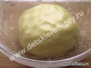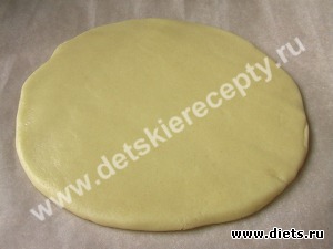5. Разделить тесто на две неравные части: 1/3 и 2/3. Большую часть раскатать в круглую лепешку толщиной около 1 см. (При выпечке тесто поднимется в 1,5-2 раза.)