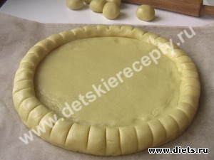 6. Налепить и свернуть бортик пирога и тыльной стороной ножа нанести на него насечки.