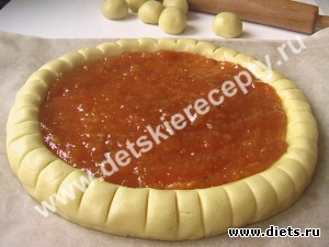 7. В центр открытого пирога выложить слой густого варенья. Варенье можно взять любое: абрикосовое, малиновое, из черной смородины, черничное и т.д. Главное, чтобы оно было густым и не растекалось, иначе при выпечке оно будет стекать на противень и подгорать.