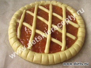 8. Из второго куска теста сделать жгутики и выложить из них решетку на открытый пирог с вареньем.