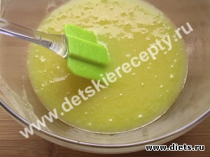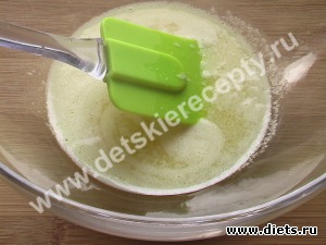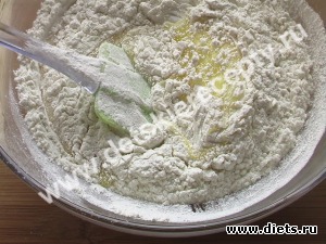 3. Муку смешать с разрыхлителем. Постепенно всыпать муку в тесто.