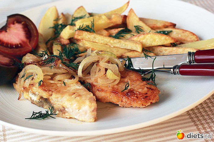 Подготовленные куски рыбы опустить в молоко, смешанное с солью и перцем, обвалять в муке и поджарить. Отдельно поджарить в масле свежие или консервированные помидоры, разрезанные пополам, подсоленные и посыпанные перцем. Лук, очищенный и нарезанный кольцами, также подрумянить на сковороде в масле.