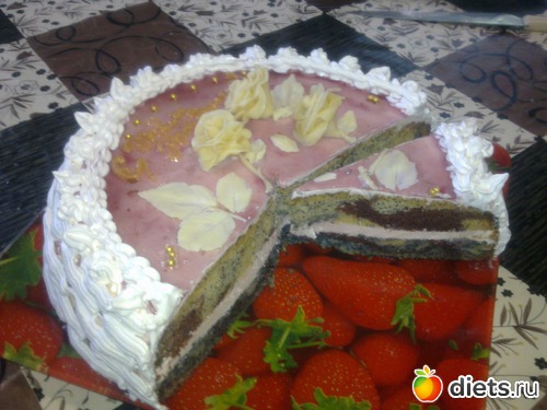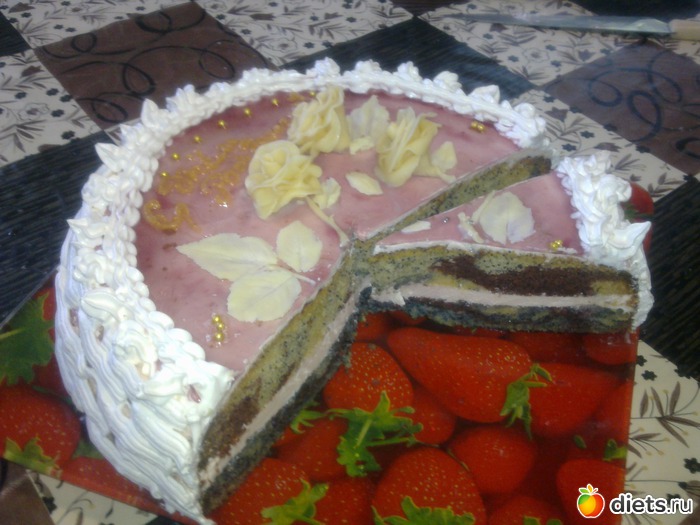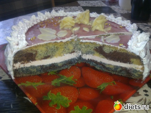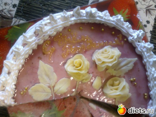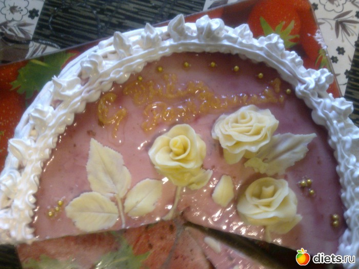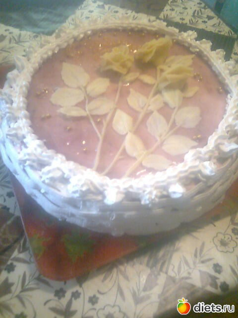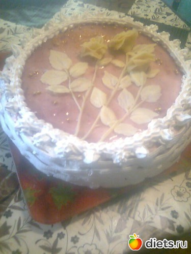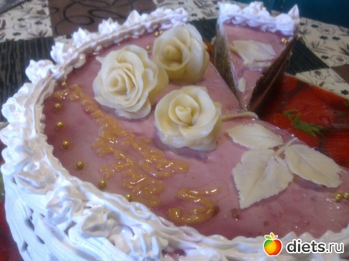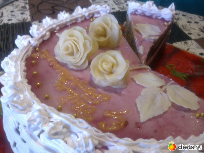 Сверху залила торт желе (у меня из компота черешни), Бока оформила белковым заварным кремом.