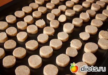 Охлажденное тесто нарезаем на ломтики толщиной около 6 мм. Кладем на застеленный пергаментом противень