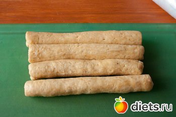 Формируем из теста колбаски толщиной 2,5 см, заворачиваем в пищевую пленку и кладем в морозильную камеру на 20 минут.