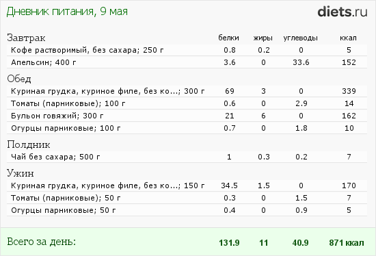 Мой первый день из 90 Ну вот и первый день моей диеты. Завтрак: (9.00) чёрный кофе. (без него не могу!!!) (9.30) 1,5 апельсина (пол апельсина скушал сынишка). Обед планирую в 14.00. До этого буду пить воду, зелёный чай. Пока настроение хорошее, не смотря на то, что вес прибавился.