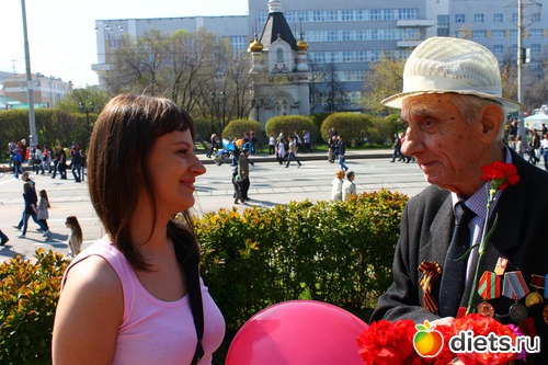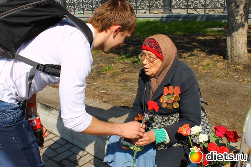 Последний раз я была на параде года 3 назад, так ветераны гуляли в центре, их было много. А сейчас.. Я понимаю, что они уже в преклонном возрасте. У нас было всего 10 цветочков, так мы их с трудом раздали. Было приятно видеть их счастливые улыбки.