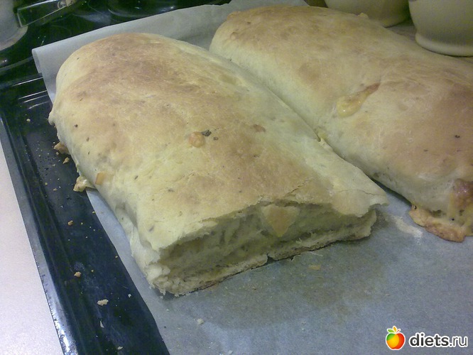 Делим тесто на две половины. Из каждой формируем "длинный батон" и укладываем на противень, предварительно выстеленный пергаментной бумагой. Накрываем полотенцем и даем подойти. Внимание - между лепешками должно быть расстояние - они увеличатся в размере! Можно для верности вставить между ними пергаментную бумагу