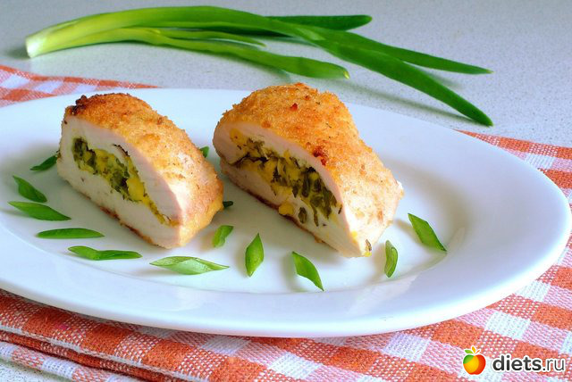 В каждом курином филе сделать глубокий разрез, чтобы образовался кармашек. Филе нафаршировать начинкой.