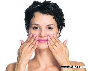 Далее внешней стороной пальцев поглаживаем щеки от переносицы к вискам и от уголков рта к ушам.