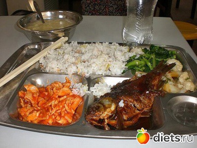 Состав: рыба, яичница с томатным соусом, рис, шпинат, цветная капуста и суп.