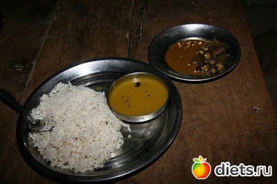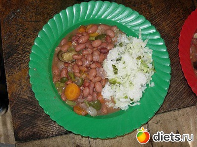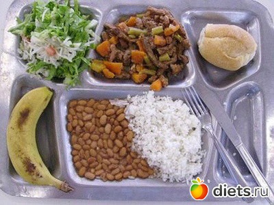 Состав: рис, фасоль, хлеб, мясо с овощами, банан.