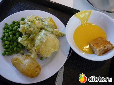 Состав: картофель, горох, курица, яблочный пирог.