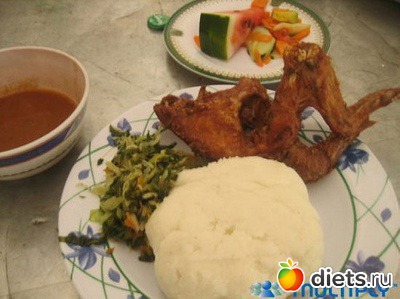 Состав: угали (каша из кукурузной муки), курица, зелень, соус, салат с арбузом.