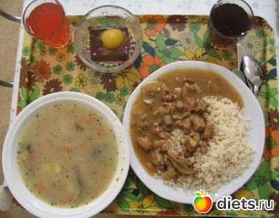 Состав: суп, рис с куриным гуляшом, десерт, сок и горячий чай.