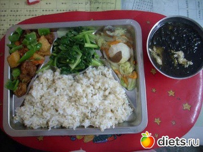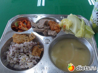 Состав: слева: свинина с ананасом, редис, морковь и зеленый перец, в центре: жареные овощи с чесноком, справа: рыба тушеная с шаром из капусты, морковь, грибы и суп из водорослей с яйцом.