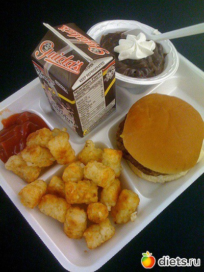 Состав: чизбургер, tater tots (плавленый сыр и картофель), молочный шоколад, шоколадный пудинг.