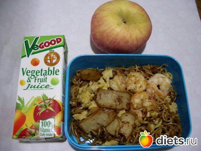 Состав: лапша с креветками, рыбой и яйцами, пакет сока и яблоко.
