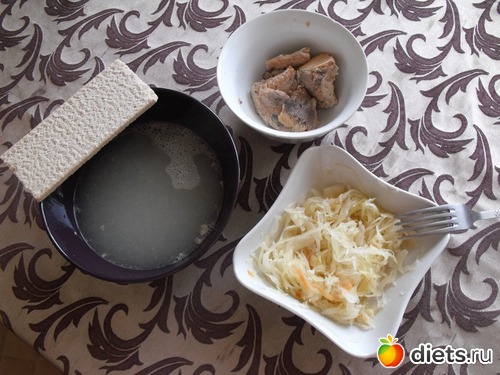 Обед: бульон из горбуши, горбуша из бульона, квашенная капусточка с парой капелек оливкового масла и ржано-пшеничный хлебец