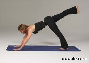 Думаю, что об этой позе йоги не слышал только ленивый. Сегодня мы расскажет о модифицированном варианте этой асаны. Встаньте на четвереньки, кисти находятся непосредственно под плечами. Колени расставлены на ширину бедра. На вдохе оторвите колени от пола, так чтобы ваше тело приняло форму буквы «V». Если вы только начинаете, тогда можно держать колени слегка согнутыми, а стопы оторванными от пола. Регулярно тренируясь, вы сможете выпрямить колени и поставить пятки на пол. Сделайте 5 глубоких вдохов и выдохов. После этого на вдохе поднимите одну ногу вверх так, чтобы она стала продолжением линии, которую образовало ваше тело. И сделайте еще 5 – 10 глубоких выдохов и выдохов. Затем медленно опустите ногу, встаньте на колени и повторите для другой ноги.