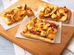 Для приготовления соуса жир прогреть, подрумянить в нем муку. В качестве жидкости можно использовать бульон из кубиков. Варить 6-8 мин. Затем приправить сливочным маслом, при желании добавить сметану или сливки. Фруктовое пюре добавить в соус за несколько минут до конца варки. Соус заправить сахаром. Дать остыть. Приготовить дрожжевое тесто, дать подойти, еще раз тщательно вымесить и выложить на смазанный маслом противень. Корейку порезать тонкими полосками или кружочками, выложить в блюдо и залить половиной соуса. Дать постоять 5 мин, выложить на приготовленное тесто и залить оставшимся соусом.