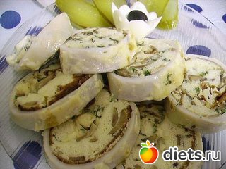 Перед подачей на стол освободите рулеты от пленки, нарежьте ломтиками толщиной 1 см и выложите на блюдо.