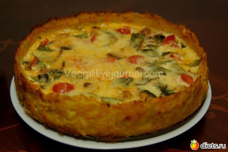 Овощи натереть на мелкой терке, посолить и оставить на 10 минут, после чего как следует отжать. Смешать овощи с маслом и мукой, перемешать. Форму смазать маслом, выложить в нее овощную массу, сделать бортики, разровнять и вообще привести в подобающий корзинке вид. Выпекать корзинку при 190 градусах около 20 минут.
