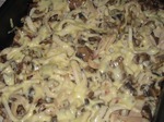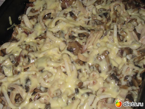 4. Смешать кальмары с грибами, положить в антипригарную форму, посыпать тертым сыром и запекать в духовке на максимальной температуре 10 минут