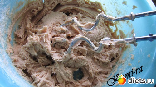 Мягкое масло немного взбить с помощью миксера, добавить пол стакана сахара, соль, постепенно ввести 1 яйцо и 2 желтка. Всё вместе хорошо смешать. Всыпать муку, крахмал, разрыхлитель и корицу, хорошо перемешать. Получается густо тесто.
