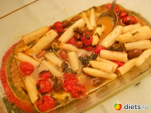 Взяли пучок белой спаржи, почистили, порезали каждый стебель на 3 части, добавили помидорки-черри, горсть оливок, много зелени свежего базилика, сбрызнули оливковым маслом, посолили, поперчили и поставили в духовку запекаться минут на 30-40.