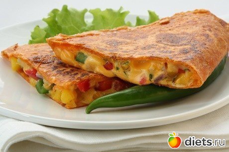 - Когда почти вся жидкость на поверхности омлета испарится, перевернуть его на другую сторону и готовить еще 5 минут. Подавать горячим.