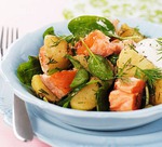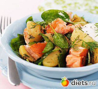Картофель отварить в мундире; очистить пока он не остыл и произвольно порезать кусочками, заправить 1 ст. л. оливкового масла и перемешать. Добавить кусочки лосося к картофелю, сбрызнуть лимонным соком, посолить и приправить черным перцем. Перемешать. Добавить шпинат и укроп, приправить салат сметаной, перемешать и быстро подать к столу, пока салат не остыл.