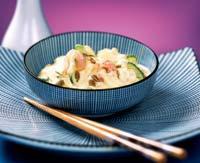 Тем временем очищаем огурец от кожицы и семян, тонко нарезаем. Креветки нарежем кусочками примерно по 2,5 см. В миску с луком и чесноком добавляем креветки, огурец и йогурт, после чего перемешиваем.