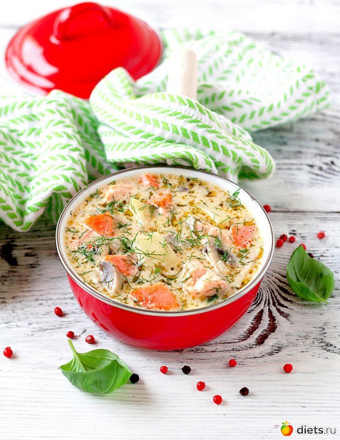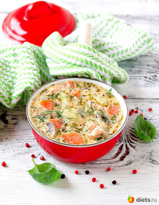 3. После нарезать на небольшие кусочки филе форели и добавить в суп, готовить 5 минут. После развести крахмал с водой и влить в суп, перемешать.