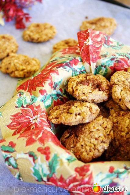 Заранее разогреть духовку до 200С. Смешать в глубокой миске муку и отруби. Отдельно натереть на терке морковь и яблоко, мелко нарезать сухофрукты. Тщательно смешать с мукой, добавив по щепотке корицы и имбиря. Добавить оливковое масло, перемешать. Сформировать небольшие печенья, выложить на пергамент, выпекать 10 минут, потом снизить температуру до 180С и подождать еще минут 30.