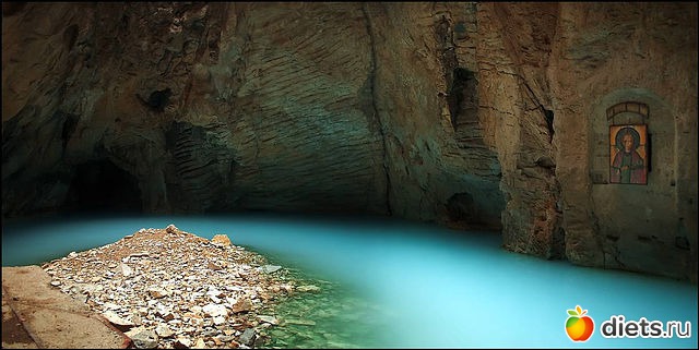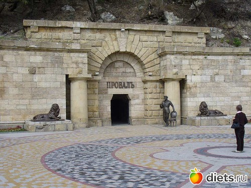 Далее известный всем ПРОВАЛ из "12 стульев" На входе памятник великому комбинатору а вот и само сероводородное озеро необыкновенного бирюзового цвета. Напротив, на стене грота установлена икона целителя Пантелеймона. Глубина озера 11 м, ширина 15 м. Температура воды от 26° до 42 °C.