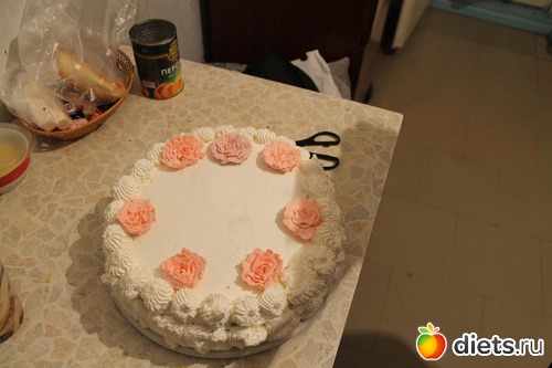 Бисквит получается ровный однородный, пышный. Я его остужаю и режу на 3 части. Покупаю сливки для взбивания (честно, мне подруга купила