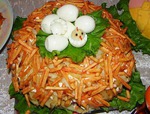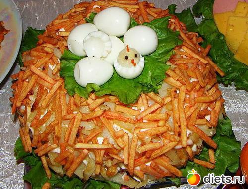 6. Заправить салат майонезом, либо сметаной и выложить на блюдо в виде гнезда. Сверху по краям выложить оставшийся жареный картофель.