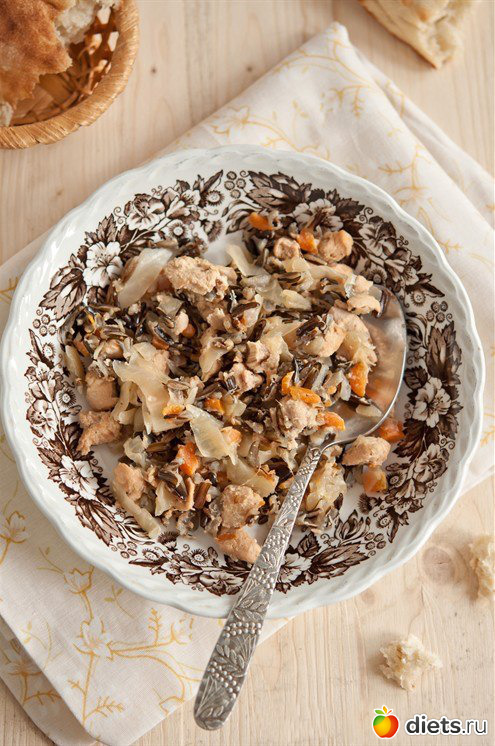 Куриное филе нарезать небольшими кусочками. Дикий рис предварительно замочить в горячей воде в соотношении 1:1 на 30 минут.