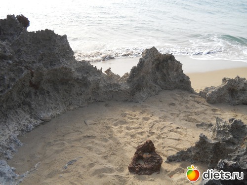 Пляж с нежнейшим песочком И окаймлен такими вот маленькими скалами из ракушечника