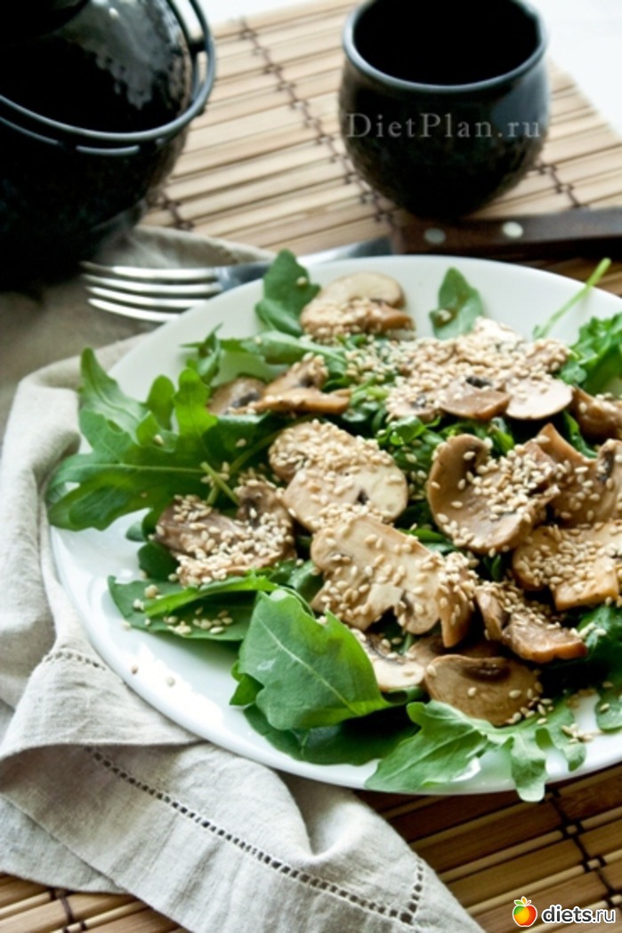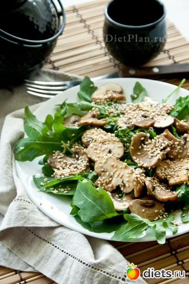 5. Выложите на тарелки рукколу, сверху уложите маринованные грибы и посыпьте кунжутом. Брызните заправкой и, по желанию, украсьте мелко нарезанным зеленым луком.