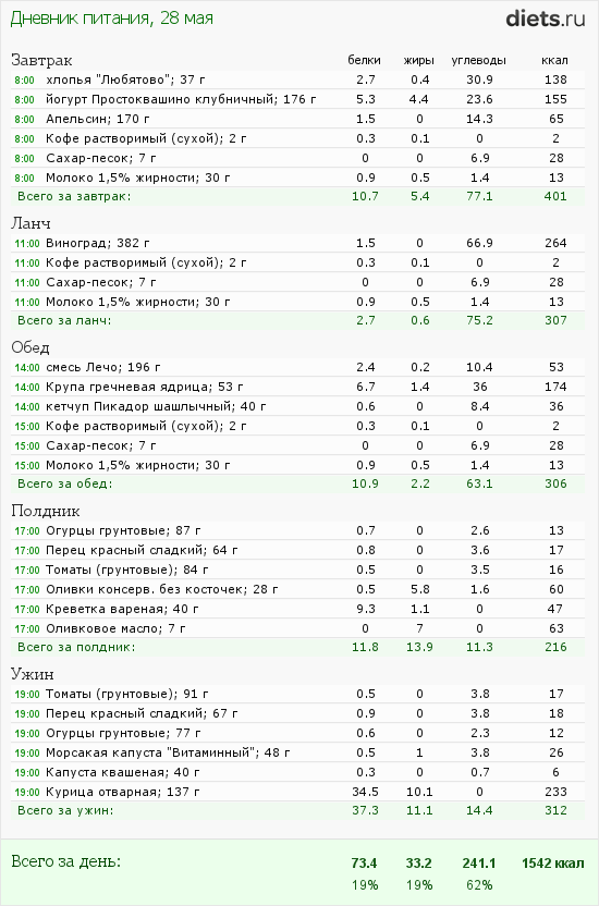 На работе съела творожную Активию, выпила кофе. На первый обед съела ролл из низкокалорийного лаваша с овощами и нежирной сметаной. Потом снова кофе. На второй обед ела макароны с овощами.